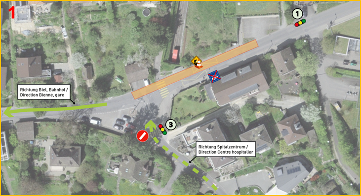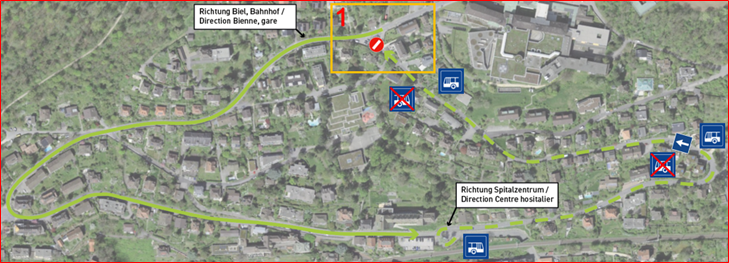 - Spitalzentrum → Port, Bellevue: ab Spitalzentrum über Tschärisplatz bis zur Haltestelle Kloosweg, dann normale Strecke