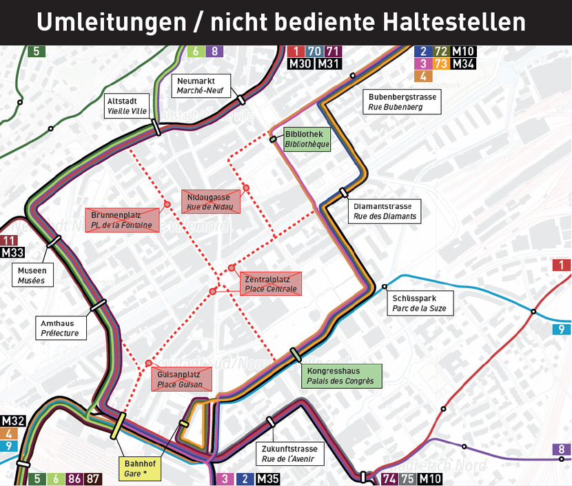 Von Freitag, 20. Februar 2026 (ab 13:30 Uhr), bis Sonntag, 22. Februar 2026 (Betriebsende) wird das Stadtzentrum nicht bedient. Die Haltestellen Guisanplatz, Zentralplatz, Nidaugasse und Brunnenplatz werden in beiden Richtungen nicht bedient. Die Busse werden über die Silbergasse oder die Spitalstrasse umgeleitet.