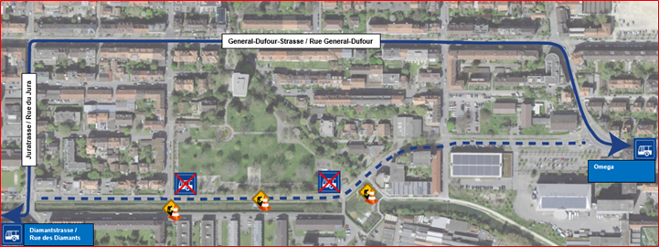 Der Bus wird über die Dufourstrasse umgeleitet und fährt ohne Halt zwischen Diamantstrasse und Omega, wie im untenstehenden Umleitungsplan.