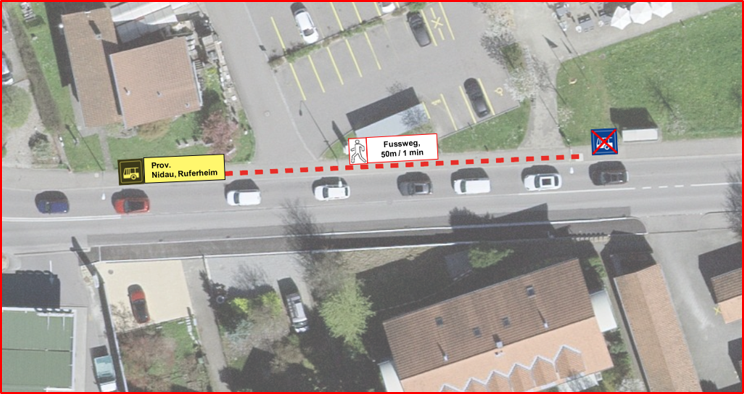Wegen Bauarbeiten wird die Haltestelle Ruferheim in Nidau (Richtung Spitalzentrum) ab Montag, 26. Januar 2026, 07:30 Uhr, bis Ende März 2026 um ca. 50 m verschoben (siehe Plan unten).